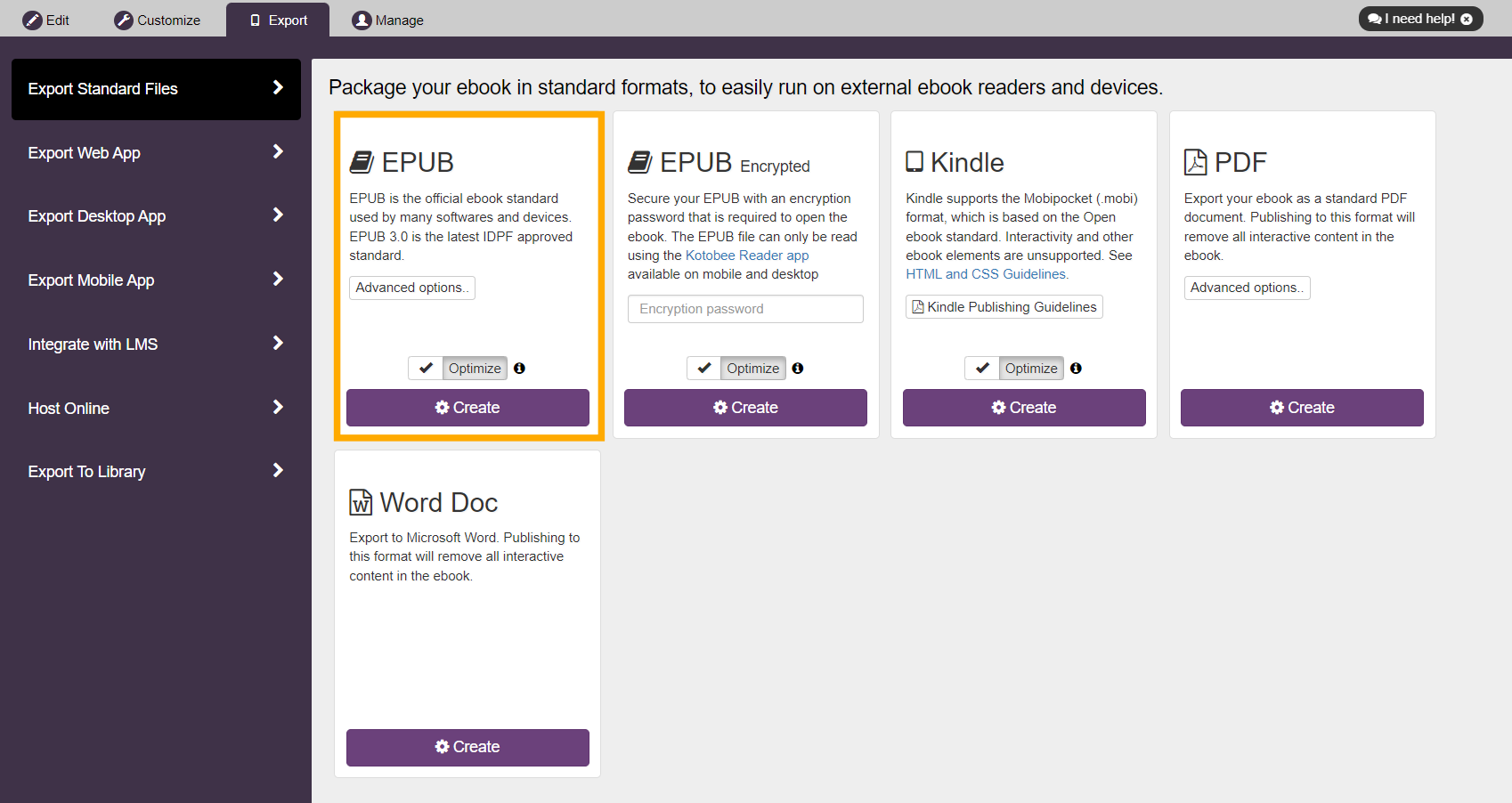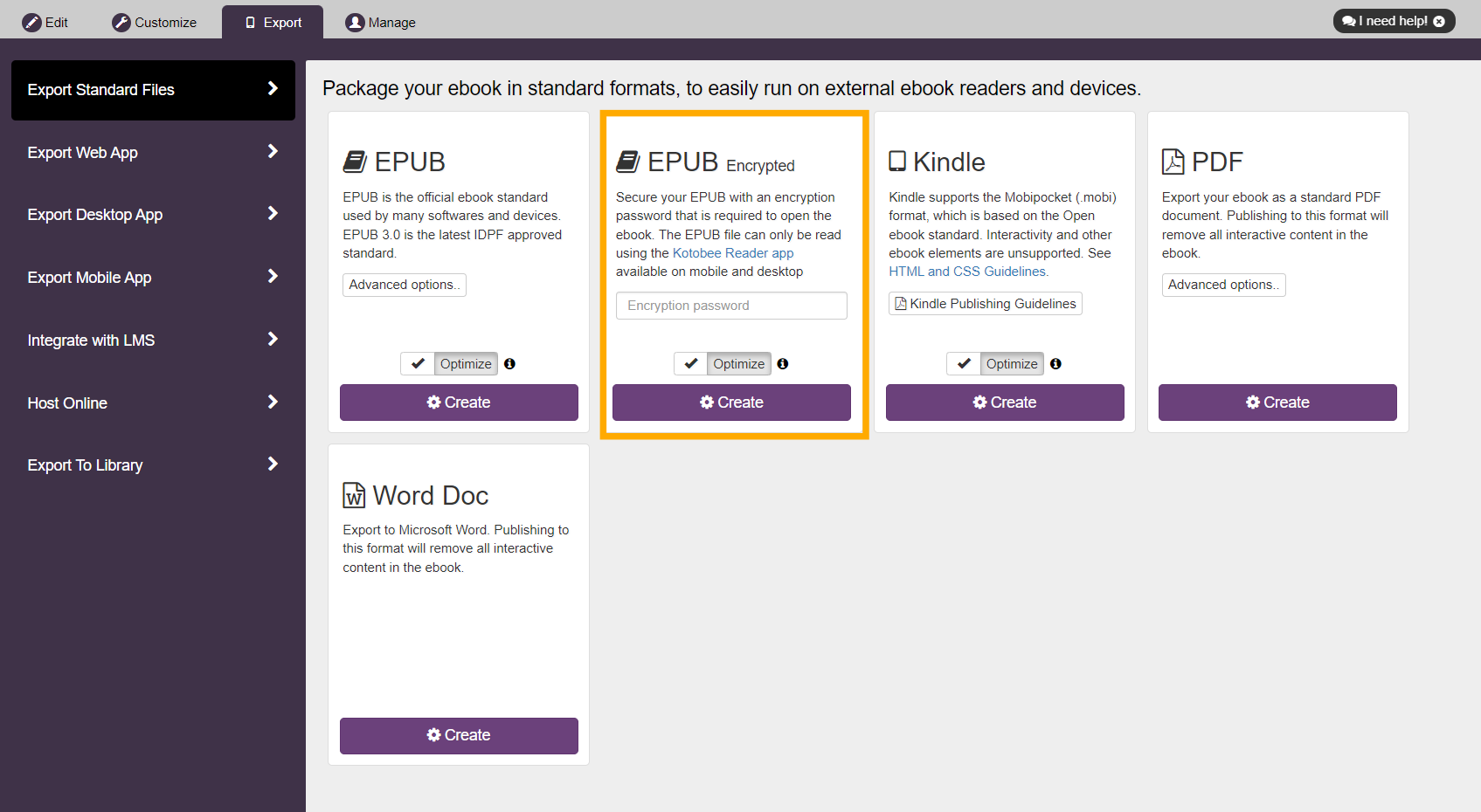 Learn how to export a standard EPUB or an encrypted EPUB ebook with the help of Kotobee Author.