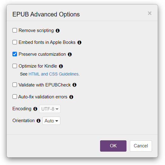 Checking this option will remove CSS styling or unsupported interactivity that may prevent your EPUB file from being uploaded to Amazon KDP. See Amazon’s formatting guidelines here. - Validate with EPUBCheck