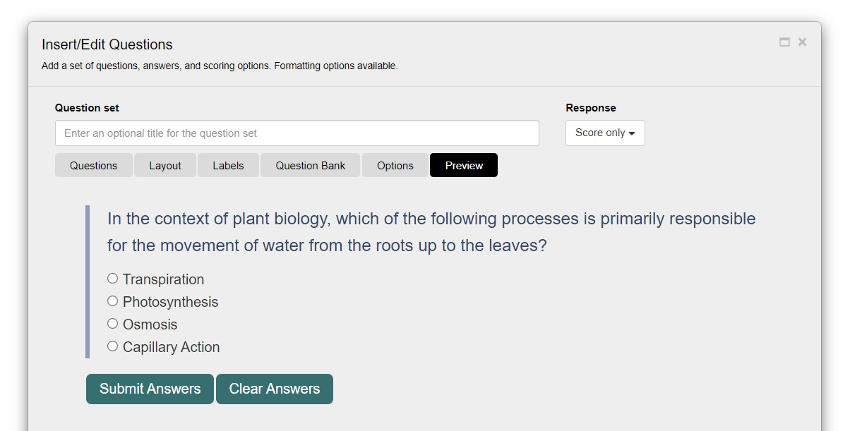 Tip: To randomize the order of multiple-choice answers each time the question is loaded, enable the Shuffle MCQ Answers option from the Customize Your Answer Options settings.Previewing your Question