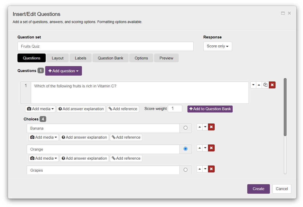 - Fill in the question text and choices. In addition to text, you can also add images or audio clips directly inside each answer choice. For example, you can show four pictures of animals and ask learners to choose the correct one, or insert audio pronunciations in a language quiz and have learners match the sound to the right word.
