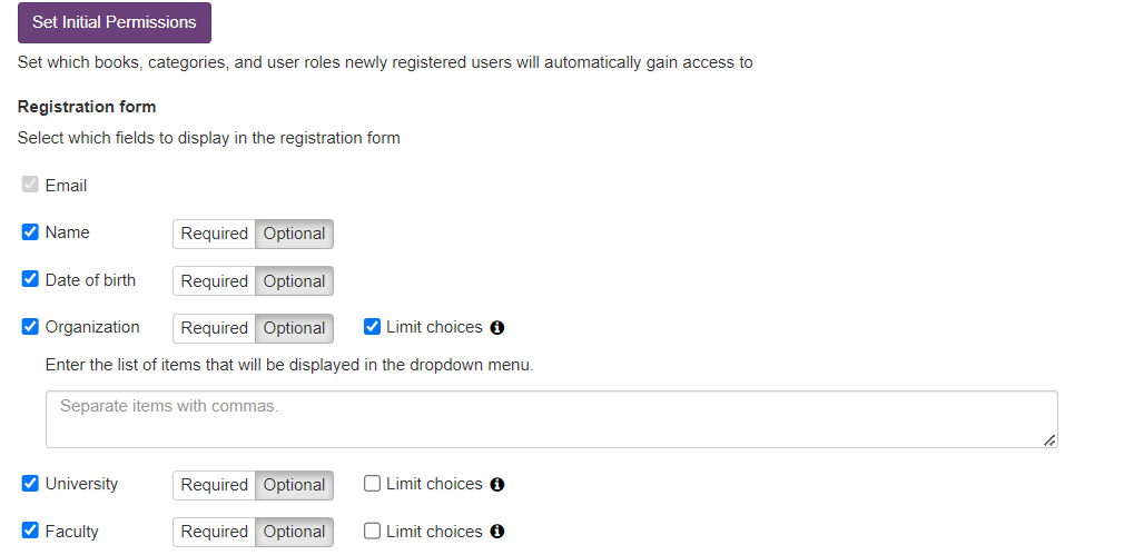 You can customize the registration form to collect additional details from users. In the Registration form section, select or unselect fields such as Name, Organization, or Country, and set whether each field is required or optional.