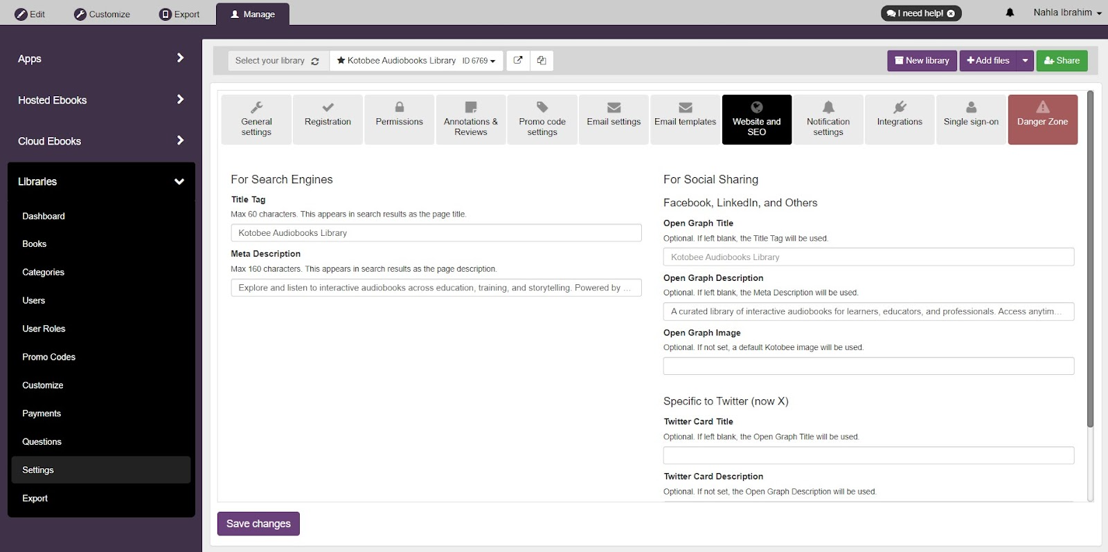 Learn how to customize the SEO metadata and social media preview tags for your library web app in Kotobee.