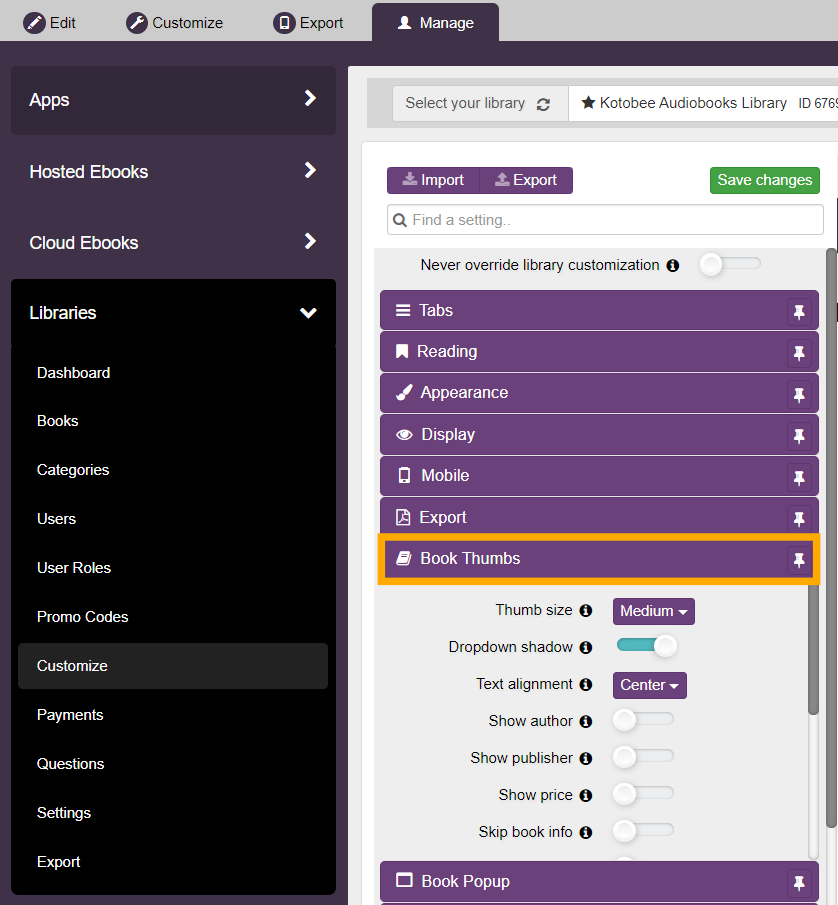 The Book Thumbs settings allow you to control how book thumbnails and related information appear in your Kotobee Library. These options help you fine-tune the visual layout of your library and decide how much information is shown for each book.